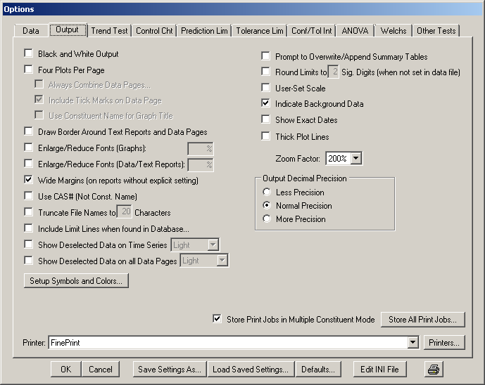 Store Print Jobs in Multiple Constituent Mode: When this option is checked, launching a Multiple Constituent run (that is, selecting an item from the Analysis menu when the selected Constituent is “MULTIPLE CONSTITUENTS>>>”) will open a new window entitled Stored Print Jobs. When this window is open, printing will be deferred, and a preview will be created instead. When the Multiple Constituent run is finished, the window will remain, allowing for viewing of the reports before printing. Until this window is closed by the user, any printing will be added to the preview, so interactive reports can be added. Finally, a right-click menu allows for reordering and deletion of pages. Then the entire set of reports can be printed as a single print job.