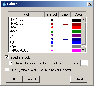 Hollow Censored Values : Used in conjunction with Solid Symbols above, this option will cause Sanitas to display a hollow symbol to indicate non-detect and/or trace values. The Include these flags field allows the user to enter a flag such as “j” or “tr” (the latter of which is actually two flags to be clear, so while it would achieve the desired effect, entering “t” or “r” would also be sufficient to include values flagged with “tr”). Values having flag characters found in this field will be plotted hollow in addition to the default of values beginning with the character “<”.